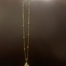 So beautiful! Ordered on: 11-11-2019 Received on:12-01-2019 Packaging: The package came in a secure bag that kept it perfectly intact, it was also wrapped in an additional plastic wrapper! Product: The material is different in the chain part and the actual shell. The chain is made up of a metal material and the small beads spread out are a plastic like material painted in gold, it is not possible to tell unless you feel it with your hands. The shell pendant appears to be an actual shell covered in a material to make it shiny and protect it, it is also painted with stripes of gold that seem to be sealed in. There is no flaking or scratching I’m very impressed, the spikes on the shell are a bit pointy so be careful to not press into your chest when wearing! Overall: I would definitely recommend the item you get exactly what is pictured, as long as you treat it with care it will last a while. Thank you store!! :)