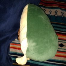 Incredibly soft fabric and somewhat loose stuffing means it's extremely huggable. Had a little difficulty staying sitting upright due to the large avocado butt. Too soft and cuddly for me to care. 5/5