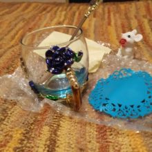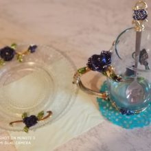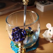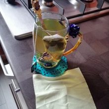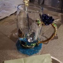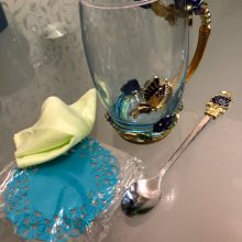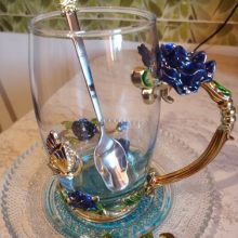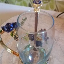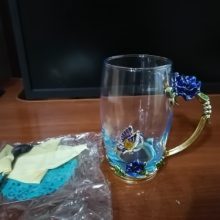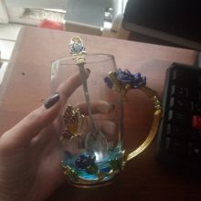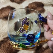 The girl of 20 years was delighted with the mug. I, a person of 40 years, treated calmly)) Gypsy gilding. But made relatively high quality. Everything is glued and painted. Even a butterfly from the inside. On the cup holder you can see traces of the molding (?). Spoon flat. Metal, but light. A small turquoise napkin is silicone. Very, very long shipping. Despite being paid. The store on the contact goes)) good, and he also suggested that local delivery slows down.
