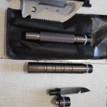 And it also has a glass breaker at the end of the handle, a whistle. I believe it has one more uses but it skips my mind at the moment. Obviously this can be used as a weapon in a couple of different ways. Oh yes, it looks like it has a couple of bottle openers. I have yet to use it but because of its sheer girth and mass it’s seems to be heavy duty enough to do extreme jobs and the grooves for screwing the handles on and off seem to be machined very well!
