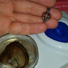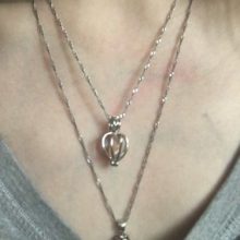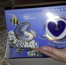 I loved both the necklace and the pearl. The necklace chain is of great quality, very shiny and thick with a strong clasp. The pearl itself was shiny and a lavender purple color, which according to the card represents wealth. The pearl was more egg shaped than round, and fits in the locket perfectly. The other thing I like is that the cage of the pendant has a three loop mechanism to thread the chain thru instead of an open-close hinge snap. So basically it could never accidentally open. It’s really beautiful and substantial! I was expecting a fishy smell or odor inside the shell, but it didn’t smell like anything. I mean the oyster meat stuff is there but it’s just water. Anyway, I love it , the price, and the quality. Finally a purchase I don’t regret or have to supplement parts