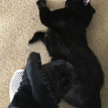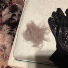 It also arrived super fast. I spray the palm side of it with a coat refresher, more to just get it wet, but the slight fragrance is nice too. From there I brush her firmly, all about her body, belly, hinds, tail, and the top of her head. I probably only stroke her 10-15x total. After that, the mitt is covered in hair, I mist it again and peel off the hair in 1 big damp clump. I will say stray hairs can go floating, and occasionally little puffs will scatter..but I’m thinking that would happen with any brushing, and it’s in fact pretty limited, with the dampening of it. I do it maybe once a week and there doesn’t seem to ever be less hair! Perhaps that means I should be doing it more. I shall.