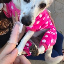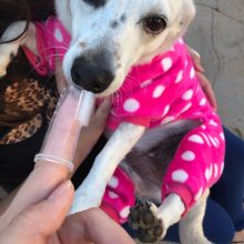 – Put a dab of pet toothpaste on bristles and slide finger inside pet’s cheek