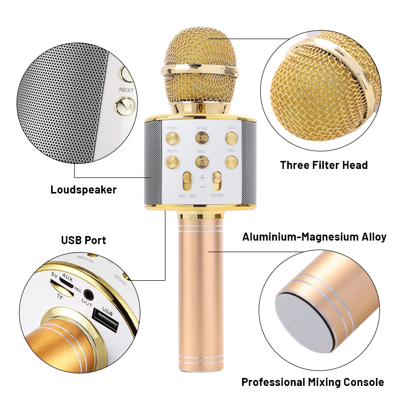 – Portable and durable, easy to carry and use. A speaker is built into the mic.